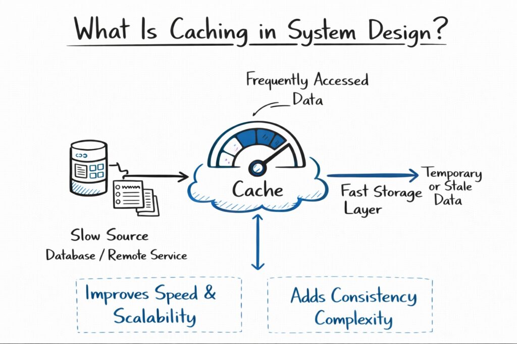 In System Design interviews, caching is treated as a performance optimization layer rather than a primary source of truth. Cached data is usually derived from another system and may be temporary or slightly stale.
