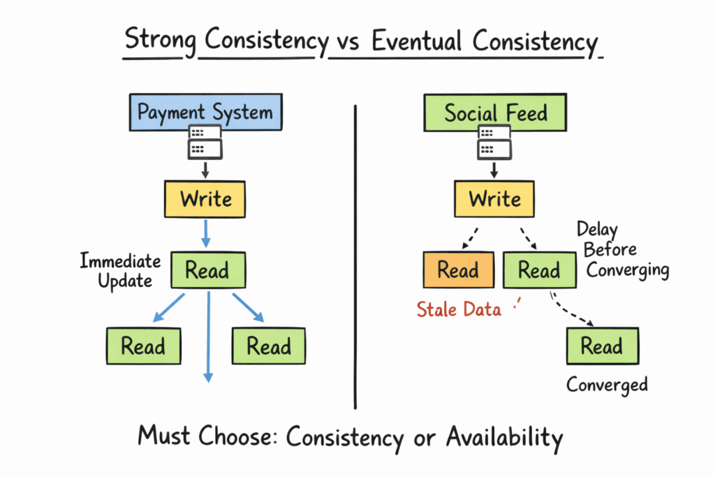Interviewers expect you to know this distinction and apply it appropriately. Payment systems often require strong consistency. Social feeds usually tolerate eventual consistency.