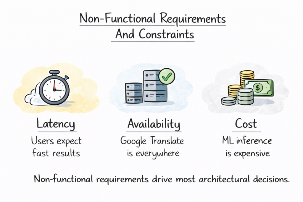 Non-functional requirements drive most architectural decisions. Latency matters because users expect translations quickly. Availability matters because the service is often embedded into other products. Cost matters because machine learning inference is expensive at scale.